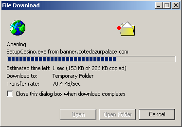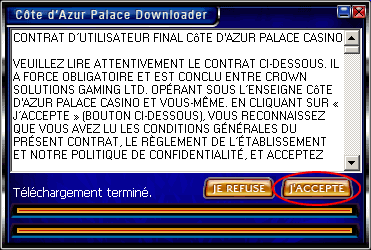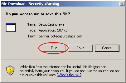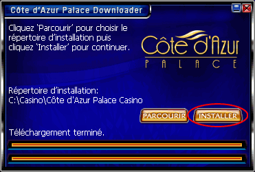 Installer un jeu de casinoCertain d'entres-vous ne sont peut-être pas familiés des logiciels de casino en ligne et encore moins de la procédure d'installation du soft sur leur ordinateur. C'est à cet effet, que j'ai mis un ligne un tutorial en huit points qui vous guidera étape par étape dans l'installation de votre logiciel. Procédure d'installationCommencez par cliquer sur l'icône "Télécharger" du casino Cote d’Azur Palace. Vous pouvez le faire sur le site ou simplement procéder au téléchargement maintenant en cliquant ici. 2. Vous verrez s'afficher une fenêtre qui vous proposera d'exécuter ou de sauver le fichier. Cliquez sur "Exécuter". 3. Le téléchargement du dossier va commencer. Une barre de temps indiquera la progression du téléchargement. 4. Selon les fonctions de votre ordinateur vous verrez s'afficher l'image suivante. Cliquez "Exécuter". Si cette icône n'apparaît pas, passer à l'étape suivante. 5. Vous allez voir s'afficher l'assistant d'installation Cote d’Azur Palace. L'assistant va enclencher le téléchargement du logiciel Cote d’Azur Palace. Quand le téléchargement aura été réalisé, cliquez sur "Installer". 6. Une fois le téléchargement réalisé, acceptez les termes et conditions en cliquant sur "J'accepte" pour passer à l'étape suivante. 7. Maintenant que l'installation a été réalisée, vous êtes prêt pour jouer ! Vous pouvez choisir de jouer en mode réel ou en mode démo. 8. Vous pourrez accéder à la plateforme de jeu du casino depuis le bureau de votre ordinateur en cliquant sur l'icône du casino. |